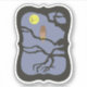 An owl sits on an old tree under a full moon on Halloween night.