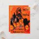 Spooky Halloween Party Invitation by Artist with goblin, blackbirds, pumpkins and black cat on top of pumpkin. Halloween art in oranges, yellow glow from pumpkins, black cat and blackbirds. Text "You're invited to a spooky Halloween Party."