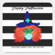 Set off your goodie bags of candy with these Spooky Halloween Party Witch Personalised Square Stickers. They are designed with a black and white stripes background and the witch has a green face, orange hair and is wearing a face mask. This design was created from personal art. The text is "Happy Halloween" in white trendy handwriting script lettering across the upper centre. Your customised name or text is on the lower area.