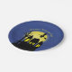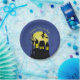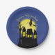 Host a magical Halloween party with this cute paper plate featuring a spooky witch flying past a haunted house on her witches broomstick. Blending scary and fun with a whimsical design, these custom party supplies are perfect for serving treats and adding festive charm to your celebration.