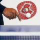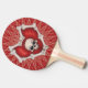 This ping pong paddle is dark red with a spiral line design and a spooky red heart outlined in bones with a skull in the centre of the heart.