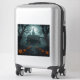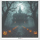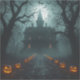 A mysterious and haunting Halloween atmosphere with a dark mansion, bats flying, and flickering jack-o'-lanterns lighting the path under a glowing moon.