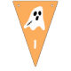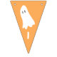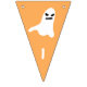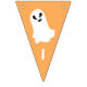 Cute halloween theme girl's birthday party featuring illustration of spooky ghosts on orange water colour with a black and white all-over print ghost pattern back. The text says "Spooky One." Original artwork by Caroline Bonne Müller