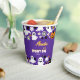 Spooky one Halloween birthday party groovy daisies retro style personalised paper cups, Halloween birthday party tableware, cute Jack-o'-lanterns, baby ghosts, black cat , spider webs orange white black purple colours