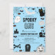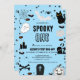 Girl's birthday party invitation card with a ghost, black cat, spider, bat, candy, candles, spider, and pumpkins in a blue Halloween theme. "Spooky On Spooktacular Halloween Ghost Birthday Invitation! Easily PERSONALIZE this design with your details!" states the text. If you require MATCHING ITEMS, please see our matching collection or shop.