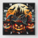 Three intricately carved pumpkins shine brightly, casting a warm glow against a backdrop of a dark, haunted castle and a witch flying through the night sky.