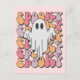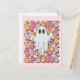 This fun and festive Halloween design features a classic ghost illustration front and centre, surrounded by the word "Spooky" repeated in a bold, bubbly font. The text is layered in vibrant, retro-inspired colours like soft pinks, purples, and oranges, creating a playful contrast against the ghost's simple white figure. The ghost's expressionless black eyes add a touch of eerie charm, while the wavy, stacked typography gives the design a groovy, nostalgic feel.