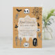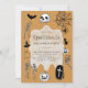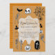 Invite your guests to a ghoulishly good time with this spooktacular Halloween party invitation! The design showcases a playful arrangement of classic Halloween icons, including dancing skeletons, a mischievous black cat, a fluttering bat, and a creepy spider. The orange and grey striped background adds a fun and retro feel, making it perfect for any Halloween celebration. This invitation is ideal for announcing your haunted house party and ensuring all your fiendish friends can join the fun. Let the spooky festivities begin with this eye-catching invite!