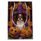Embrace the Halloween spirit with this enchanting design featuring a cute dog in a witch hat surrounded by carved pumpkins. Perfect for adding a touch of spooky charm to your festive celebrations.