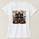 A witch stands before a decorated house, surrounded by carved pumpkins and spooky decorations, inviting children for a night of trick or treating in the autumn air.
