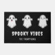 Destei's illustration of three ghosts where they all have a different kind of facial expression. The expressions include a happy ghost, a smiling ghost and a spooky ghosts. There are also two personalizable text areas. One sample text reads: "Spooky vibes" while the other one has space for a family name or other custom text such as "welcome". The background colour is black, but it can be changed to any other colour as well, if so wished. This design is a fun way to add some spooky Halloween decor.