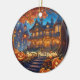 This Ornament features a spooky mansion in the forest with illuminated windows surrounded by lots of pumpkins. Perfect Halloween decor! Custom text.