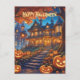 Spooky villa in the forest, pumpkins, Halloween Postcard