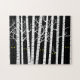 Puzzle shows a white birch tree forest and spooky, scary yellow eyes staring out between the trees on a creepy, dark, black night. There are no cute birds or deer in these woods, just monsters. Novel, funny, humourous, original take on a classic design.