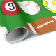 This wrapping paper has a novelty design of different sports balls, including basketballs, baseball, billiard balls, soccer balls, footballs, and golf balls.