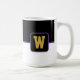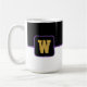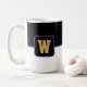 Coffee mug is shown here with a colour block style print with a sample letter, customise and change colours and letter or buy as is.