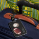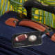 Sports themed luggage tag with place for custom text. Football and baseball images on black with printed light grey text on front for a name and contact info. Insert a card with travel information on reverse.