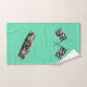 On this towel set is a race car on a green backdrop with chequered flags. Can be customised to make it uniquely your own.