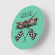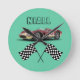 A sporty race car with checkered flags below on a green backdrop where on top is where you can personalize it with a name making it uniquely your own. Fun sporty vibes decor for any boys room.