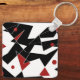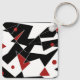 Various white and red geometric shapes are scattered across a black background, creating a stark contrast. Some shapes are interconnected with thin white lines, and red dots add a pop of color to the composition.