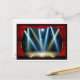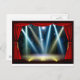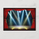 A spotlight theatre stage with coloured spotlights and red stage curtain drapes