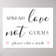 Encourage your wedding guests to stay safe with this Covid 19 wedding reception sign stating Spread love, not germs. Please take a mask" written in serif typography and a handwritten, brush script, accented by pretty little pink hearts, for a touch of romance and whimsy. If you would like me to create additional, matching products or need help adjusting this one, please contact me at admin@albamarie.com. I'd be happy to help!