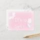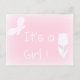 Spring baby girl - personalised birth announcement postcard. Delicate text design in light pink with white text "It's a Girl" .It features the white silhouette of a tulip and a butterfly .Ideal for announcing the birth of a cute baby girl who was born in spring .