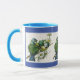 Lovely picture of two little birds sitting on a branch with flowers, are featured on this coffee mug with blue trim. Brighten your morning with this mug or give as a gift!