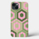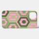 This phone case has a geometric design of hexagons in four shades of green on a field of pink stripes in two shades.