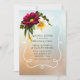 Pretty Spring inspired wedding rehearsal dinner invitation done in a peach and light blue mottled background. A white decorative framed area is decorated with a yellow daffodil and a maroon coloured daisy like flower. Lovely invitation the couple will cherish with all their wedding memories. Chose you favourite card stock and invitation shape. Matches our Spring Blooms wedding set.
