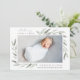 Elegant botanical birth announcement in chic pastel colours features a single full bleed horizontal or landscape orientated photo with clusters of delicate pale green watercolor leaves at the corners. Personalise with baby's name, birth stats, and a personal message, and add three additional square photos to the back.