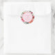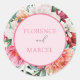 Pretty wedding sticker, round with a pink and ivory background, and a lovely floral edging.