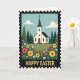 This greeting card shows a spring countryside scene framed like an old postage stamp with tiny edge notches and a lightly worn texture. In the center sits a small white chapel with a dark steeple topped by a cross, and a red front door that feels like an open invitation for friends to step inside together. Deep green evergreen trees cluster around it, set against a calm blue sky with rounded, soft clouds. The foreground is a rolling meadow packed with big golden-yellow blooms, coral-red flowers, and small white star-shaped blossoms, with extra pink and orange touches scattered between 🌷. The colors are bright but gently muted, giving the scene a cozy, affectionate look, as if the landscape is leaning in to welcome you 🐇. Near the bottom, the words “HAPPY EASTER” sit centered in large golden letters with a slightly grainy texture. The chapel’s red door stands out beneath the steeple, framed by flowers that crowd the lower edge like a natural border.