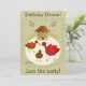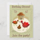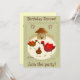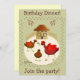 Illustration of 3 chickens playfully tossing a worm in their yard. Behind is their cute hen house with a fence. A track of chicken foot=prints surrounds the image, and a cluster of brown eggs decorate the card. Customise your message on front and inside. Inside: another chicken and a track of foot prints add charm to your invitation.