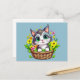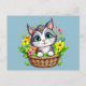 Springtime and Easter design with a cute grey and white cat in a basket with flowers.