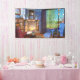 A cosy reading corner on a sunny spring day. Warm sunlight streams in through the lattice windows, leaving shadows on the wall and lighting up the cherry blossom "snowglobe" on the bookshelf. In the window is a colourful suncatcher sparkling in the light. Around the hearth are cushy armchairs, with vases of flowers and books and a steaming teacup, but the windows are open to let in the spring breeze. Outside a spring-green willow and beech hedge and red Japanese maple are surrounded by tulips and cornflowers, while a ginger cat stalks through the long grass.