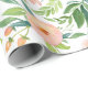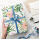 Watercolor springtime floral pattern wrapping paper in accents of peach and coral with abundant greenery.