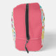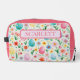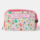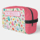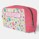 Beautiful pastel coloured Easter eggs and Spring flowers are scattered about in a whimsical pattern on the front and back of this toiletry bag. A banner at the top has an easy to use template for you to put your name on the bag. The sides and top of the bag are in a coordinating dark pink. This pretty bag is perfect for makeup or toiletries for an overnight trip.