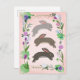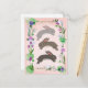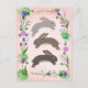 Three leaping rabbits playfully prance through the garden against a blush pink background, decorated with green cabbage leaf, clovers, purple tulips, and violet pansies. Original artwork by Noël Snow