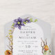 All in one tri- fold wedding invitation featuring an oblong frame watercolor spring flower arrangement with tulips, clematis and forsythia, foliage and twigs. Wedding invitation, rsvp card and envelope combination.