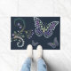 Jewelled Flower Rhinestone Butterfly Rug in purple green and, white rhinestone diamonds. Welcome Sparkly butterfly bling Mat Home Decor. Hand drawn multi-coloured jewels decorating a butterfly shape on a dark blue background. Front or back door or kitchen rug mat, Customise your text, colour, style on your jewelled butterfly mat to match your taste. Note: rhinestones are not actual, this is hand drawn jewel design on butterflies snap.