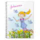 Cute graphic art of a blonde haired girl in spring time chasing birds in a field of daffodils and wildflowers. Customise with your girls name, currently reads Johanna. Original graphic art and design by Sarah Trett.