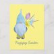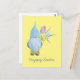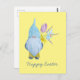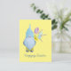 Cute watercolor tomte style gnome with sweet Spring bouquet of flowers on yellow background and customisable "Happy Easter" text.