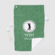 Black silhouette of man golfer in a round white frame with initials and name, on a spring green denim print golf towel. Personalise the initials and name to create a unique golf gift and keepsake. You can reverse the initials to a larger name and remove the smaller name. Use the simple Template provided to change the text and make it yours. Dimensions: 16" x 24", 80% woven polyester/ 20% polyamide blend microfiber, grommet and brass-plated hook included. Machine washable.