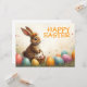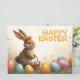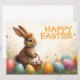 A cute Easter bunny with a flower crown sits lovingly amidst colourful Easter eggs. He holds a small wicker basket with painted eggs in his paws. The scene is surrounded by delicate spring flowers and warm light. The inscription "Happy Easter" shines above the bunny in cheerful orange - a warm greeting that captures the lightness and joy of the spring festival.
