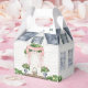 Surprise your friends at your Easter egg hunt with this spring house favour box. This favour box has a watercolor front door with an easter basket on the front porch. The back has a couple windows adorned with climbing roses. Colours used include olive green, pink, grey, and brown. A pink banner above the door reads "Happy Easter" however, this text can be edited.