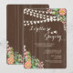 Strung lights and clusters of pink, blue and white flowers against a chocolate, wood-grain background make a lovely invitation perfect for an outdoor bridal shower, engagement party, anniversary celebration and more. (<a href='http://www.freepik.com/free-vector/floral-wedding-invitation-with-wood-texture_1048031.htm'>Designed by Freepik</a>). <br/><br/>The card is easy to customise with your wording, font, font colour and choice of six paper types.<br/><br/>Not exactly what you're looking for? All our products can be custom designed to meet your needs at no extra charge.<br/><br/>Simply contact us at askcottonlamb@gmail.com<br/><br/>Coordinating products available:
