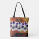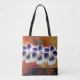 Elegant Scandinavian design. Flowers and abstract background, fashionable tote. Purple and white flower blossoms, yellow, red, brown background.