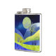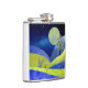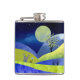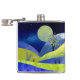 An abstract landscape depicting rolling hills with a blooming spring tree and plants and a moon and stars in shades of blue, cyan, yellow and pink.