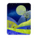 An abstract landscape depicting rolling hills with a blooming spring tree and plants and a moon and stars in shades of blue, cyan, yellow and pink.
